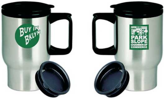 Final Reminder! Today is the first day of Park Slope’s Shop Local campaign—the Snowflake Celebration. And this year the folks at Buy in Brooklyn are offering mugs instead of umbrellas. Building on the theme of sustainability, they are partnering with the Brooklyn Green Team, a grassroots environmental group, to sell re-usable mugs (shown here) and doing their part to avoid the billions of disposable coffee cups used each year in the US. “By not using paper cups, you’re saving precious resources like trees,” said Amanda Gentile co-founder of the Brooklyn Green Team, adding, “at the same time, local businesses also save resources— money spent on countless cups, lids and sleeves your morning coffee is packaged in.” On the evenings of December 4th and 11th the Brooklyn Green Team will be selling stainless steel Buy in Brooklyn mugs in front of the Park Slope Food Coop and signing folks up for a three-month eco-challenge. Several participating stores have posted the Green Team’s challenge flyer. And Postmark Café will give a 25cent discount to anyone who brings their own mug. If you have a Buy in Brooklyn or Postmark mug, drip coffee is free!